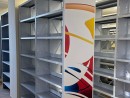 Разработали и произвели двусторонние стационарные стеллажи с цветовой печатью на лицевых стенках по авторскому рисунку заказчика. Стеллажи дополнили: разделителями полок — предотвращают перемещение хранимого в соседний отсек и разделителями папок — удерживают хранимое внутри полки. Размеры стеллажей для библиотеки были рассчитаны индивидуально под объём и формат хранимых материалов.