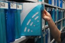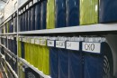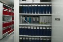 Помещение подвального типа с большим количеством коммуникаций потребовало установить стеллажи разной высоты, чтобы максимально задействовать всё рабочее пространство.